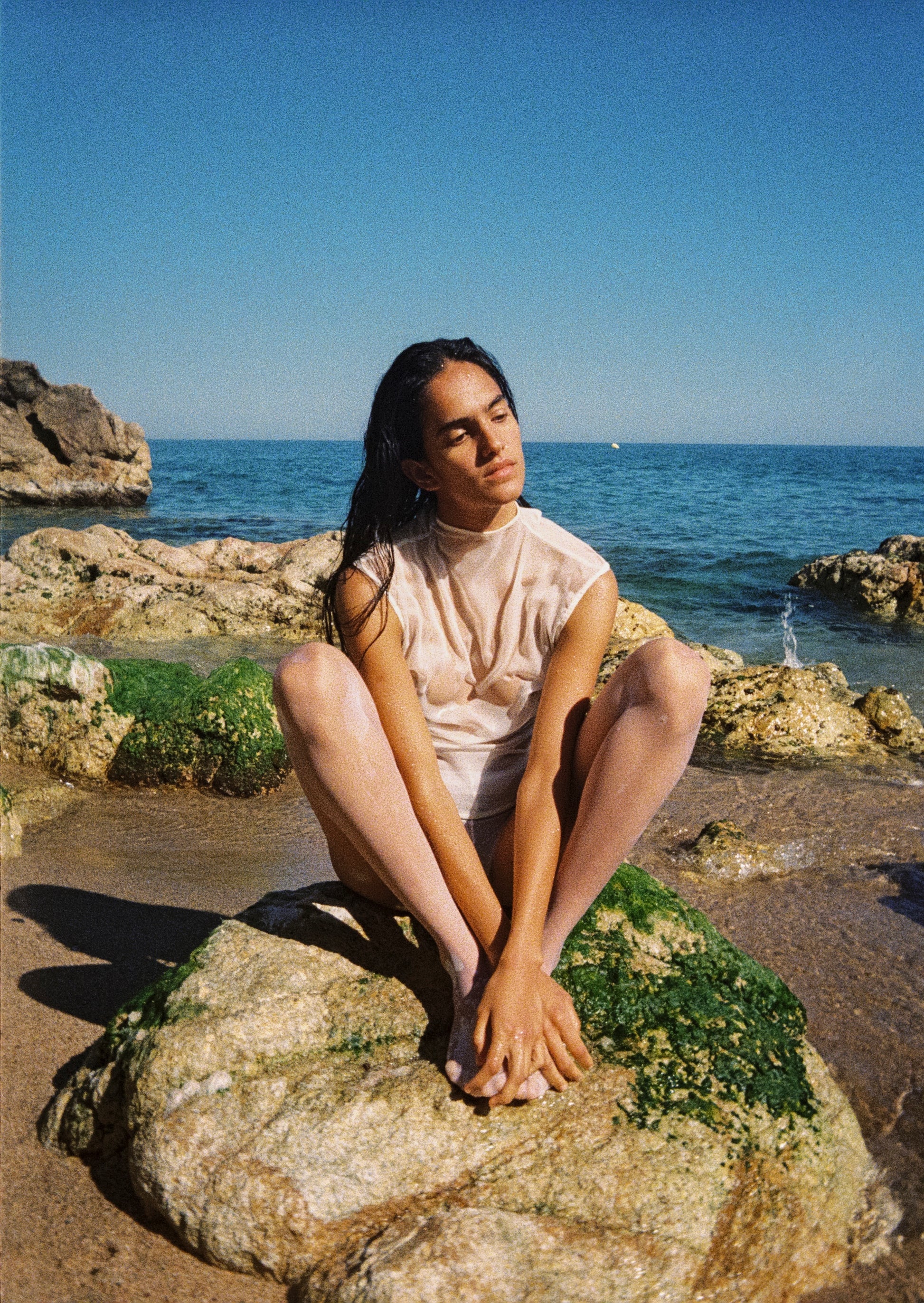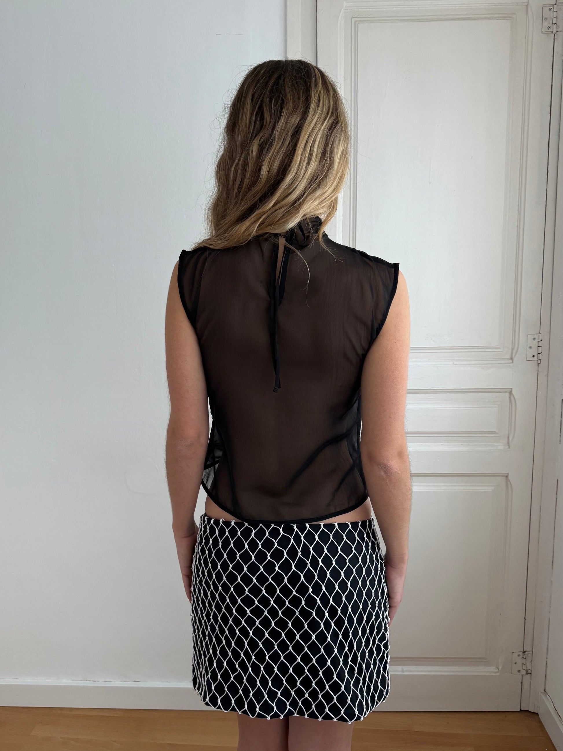 Sleeveless top with a high neck. Adjustable neck straps.